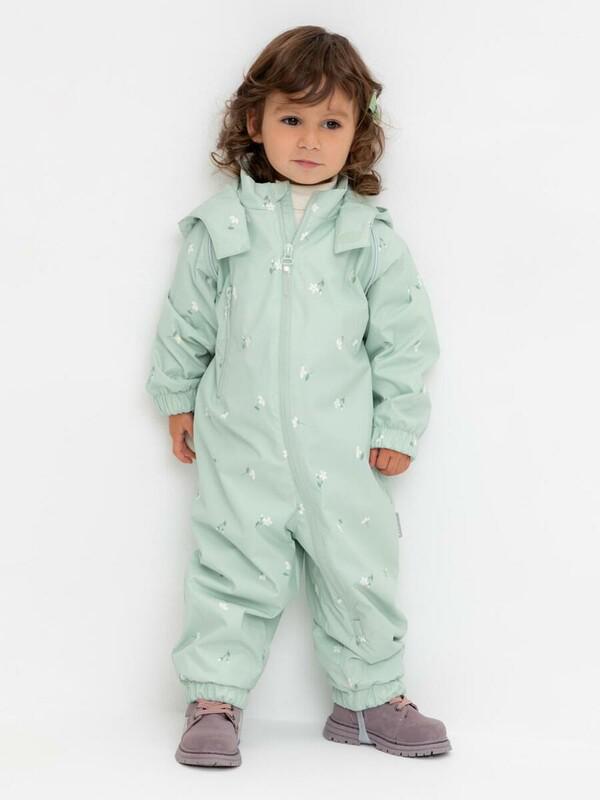 Ветровочный комбинезон ясельный из мембранной ткани с дополнительной тефлоновой обработкой. Данный вид обработки предохраняет изделие от загрязнения и лучше отводит влагу. Подклад из 100% хлопка. У изделия удлиненная молния для легкого одевания с защитой подбородка. Утяжка на капюшоне с потайными стопперами. По низу рукавов и брючин, а также на спинке изделия эластичная резинка для лучшего прилегания. Для фиксации комбинезона используются съемные силиконовые штрипки. В размерах 68-80 функциональные отвороты на рукавах и брючинах. Во всех изделиях верхнего ассортимента для безопасности ребенка предусмотрены светоотражающие элементы.