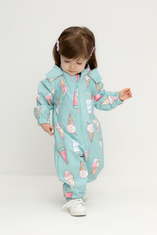 Ветровочный комбинезон ясельный из мембранной ткани с дополнительной тефлоновой обработкой. Данный вид обработки предохраняет изделие от загрязнения и лучше отводит влагу. Подклад из 100% хлопка. У изделия удлиненная молния для легкого одевания с защитой подбородка. Утяжка на капюшоне с потайными стопперами. По низу рукавов и брючин, а также на спинке изделия эластичная резинка для лучшего прилегания. Для фиксации комбинезона используются съемные силиконовые штрипки. В размерах 74-80 функциональные отвороты на рукавах и брючинах. Во всех изделиях верхнего ассортимента для безопасности ребенка предусмотрены светоотражающие элементы.