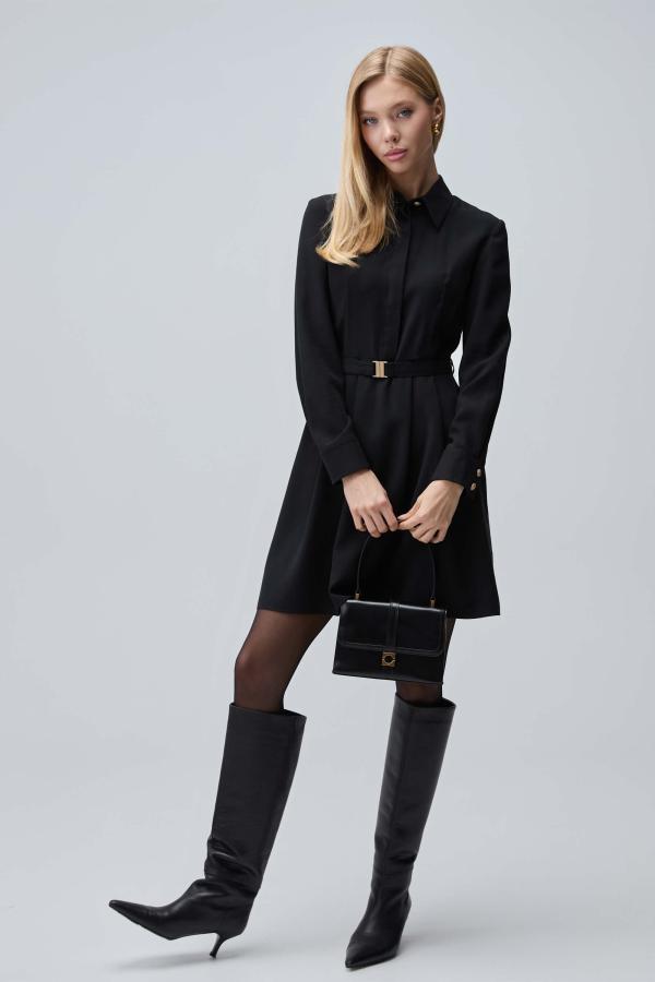 Базовое платье из вискозы тенсель. Модель полуприлегающего силуэта с отрезной линией талии. По переду супатная застежка и акцентная пуговица на стойке. Рукав втачной. В боковом шве потайная молния. В комплекте пояс из основной ткани с акцентной, металлической пряжкой.