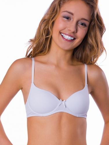 Однотонный бюстгальтер для девушек, выполненный из хлопка с эластаном, на соединителе небольшая аппликация в виде банта. У модели регулируемые бретели и уплотненные поролоновые чашки без косточек.