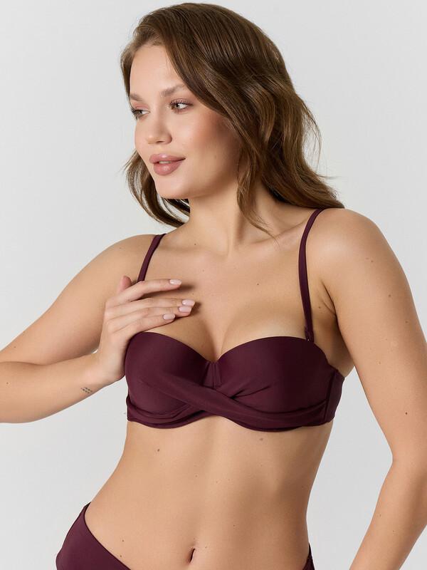 Купальный бюстгальтер «балконет». Чашки формованные, на косточках, с декоративным перекрутом полотна по переду. Съёмные бретели гарантируют великолепный загар. Благодаря составу полотна, которое быстро сохнет, отталкивает влагу и сохраняет цвет, бюстгальтер идеален для пляжа!