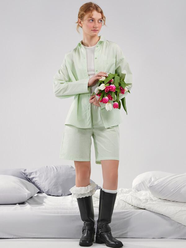 Женский комплект, включающий рубашку и шорты, станет отличным выбором для стильного и удобного образа в теплое время года. Рубашка свободного силуэта с классическим отложным воротником, спущенным плечом и длинными рукавами имеет центральную застежку на пуговицах и накладной карман на груди. Шорты свободного силуэта, удлиненные, с эластичным поясом обеспечивают комфорт и свободу движений. Этот комплект идеально подходит как для повседневной носки, так и для активного отдыха.