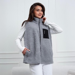 Женская жилетка свободного кроя с воротником стойка и карманами.