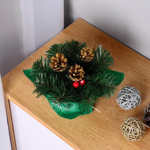 Новогодняя настольная хвойная композиция с золотыми шишками и ягодами — компактное украшение для создания праздничной атмосферы. Изготовленная из ПВХ, она сохраняет свежесть и насыщенный зелёный цвет в течение всего сезона.