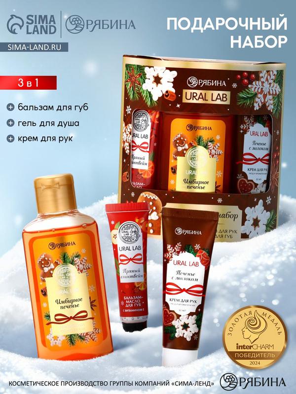 Подарочный набор новогодний: гель для душа, крем для рук и бальзам для губ, аромат печенье, URAL LAB