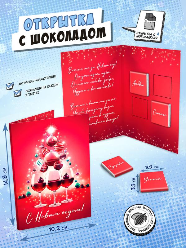 <ul><li>Состав: Какао тёртое, сахар, какао масло, эмульгатор лецитин, натуральный ароматизатор «Ваниль». Общее содержание сухого остатка какао — не менее 36,8%.</li> <li>Срок годности: 18 мес.</li> <li>Вес: 20 гр.</li> <li>РРЦ: 145</li> <li>Серия: Открытки с 4-мя шоколадками</li> <li>Вид продукции: Шоколад</li> <li>Размер: 10,2 х 14,8 х 1 см.</li></ul><br/><br/><p>Яркая праздничная открытка для отличной компании</p>