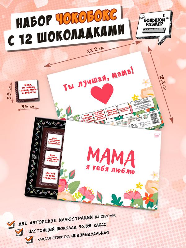<ul><li>Состав: Какао тёртое, сахар, какао масло, эмульгатор лецитин, натуральный ароматизатор «Ваниль». Общее содержание сухого остатка какао — не менее 36,8%.</li> <li>Срок годности: 18 мес.</li> <li>Вес: 60 гр.</li> <li>РРЦ: 415</li> <li>Серия: Чокобокс</li> <li>Вид продукции: Шоколад</li> <li>Размер: 22,5 х 18,5 х 2,5 см.</li></ul><br/><br/><p>Мама, я тебя так люблю. 12 плиток, 12 фраз для самого важного человека в жизни каждого!</p>