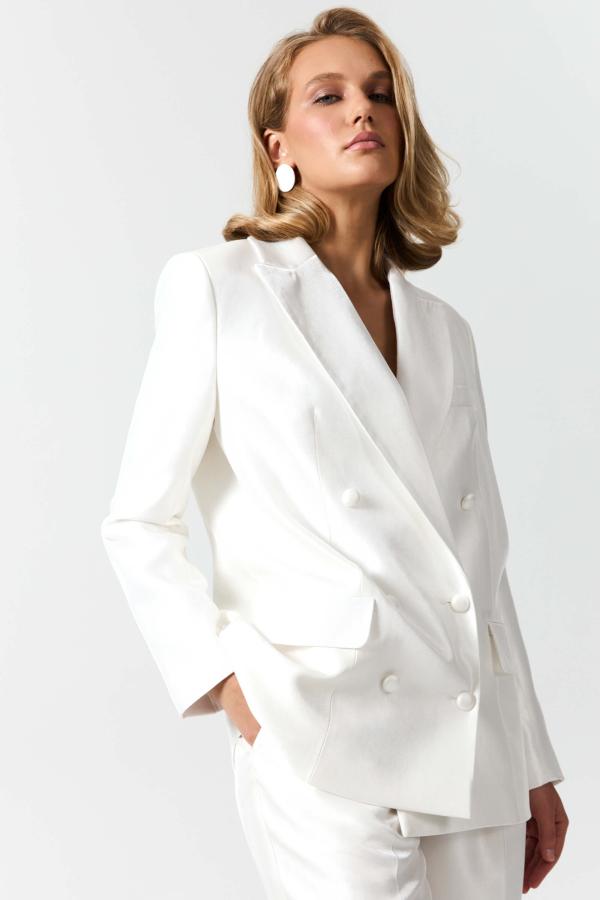 Жакет из вискозной тафты премиум качества. По переду двубортная застёжка на петли и пуговицы, карманы с клапанами. Воротник английский. По спинке открытая шлица. Изделие на подкладке из поливискозы.