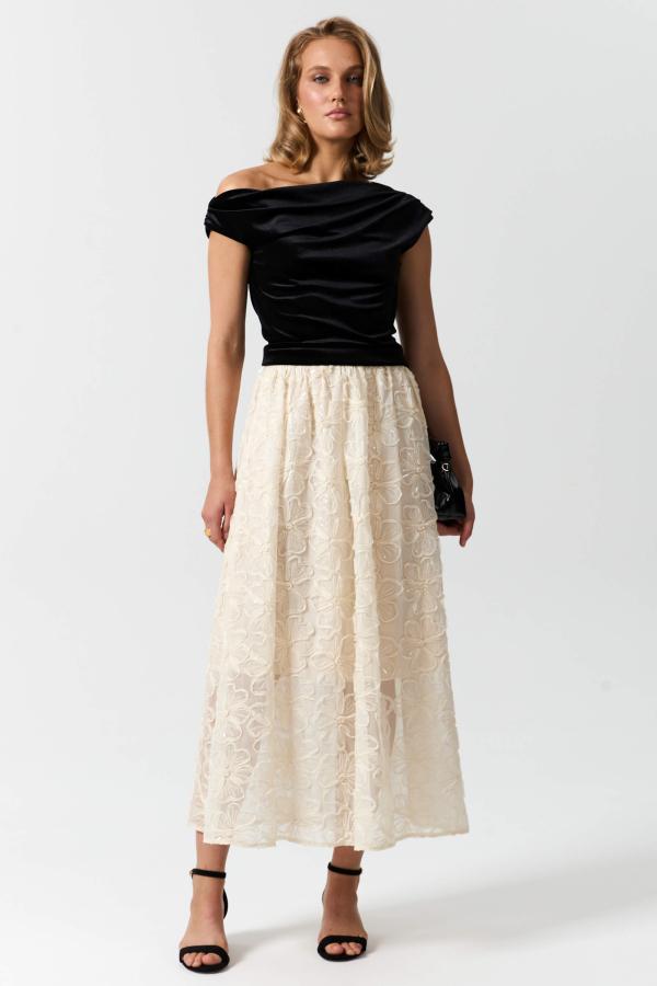 Юбка из креш-шифона с объемными цветами и пайетками. Модель свободного силуэта со сборкой и притачным поясом из атласа компаньона. По спинке эластичная резинка. Изделие на подкладе.