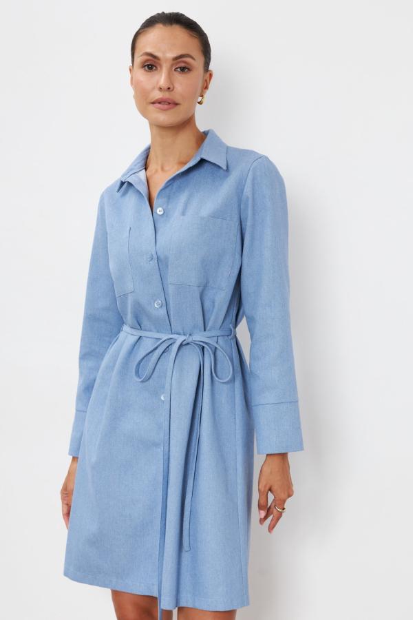 Комфортное лаконичное платье-рубашка из джинсового полотна. Модель полуприлегающая, по переду накладные карманы. Застежка на пуговицу и петли. Рукав втачной прямой. В комплекте пояс из основной ткани.