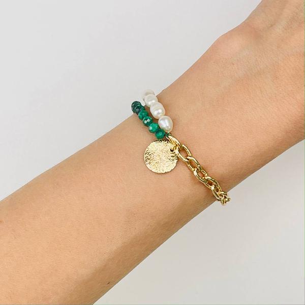 ПРОВЕРИТЬ НАЛИЧИЕ: https://samotsvet.ru/catalog/braslet-iz-malakhita-i-zhemchuga-s-tsepochkoy_1.html Цвет камня: Миксовый Месторождение: Африка Камень: Малахит Вставка: Жемчуг Покрытие: Золото 14 К Диаметр: 4-5 мм Поверхность: Граненный/Необработанный Производитель: Радуга Самоцветов ( Россия) Тип замка: Карабин с цепочкой