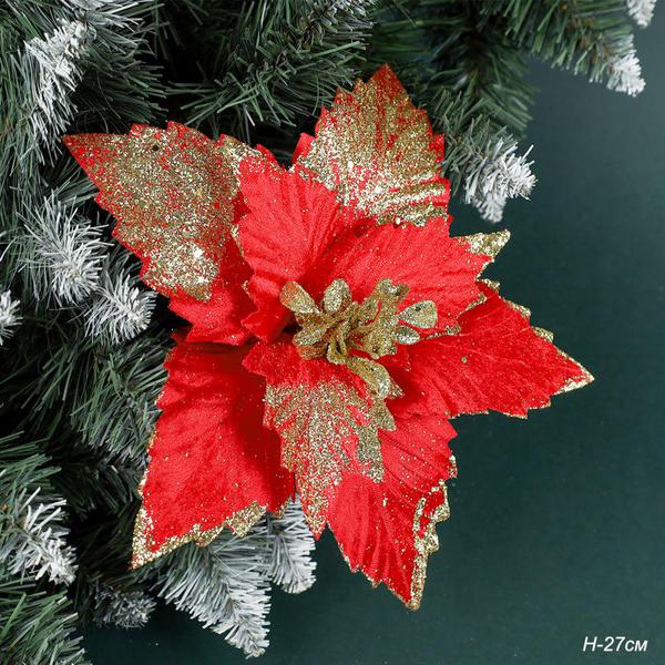 / Цветок декоративный Пуансеттия 27 см красная с золотом / P3 /уп 48/480/
