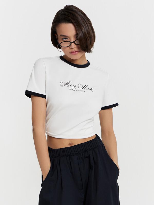 Футболка прилегающего силуэта, укороченная. Горловина круглой формы с обтачкой из основного полотна. Рукава втачные короткие, с отрезными манжетами. Нижний срез обработан швом вподибку.