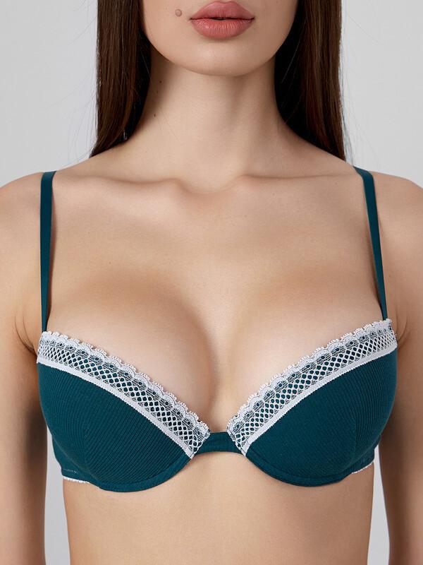 Бюстгальтер с жесткой формованной чашкой пуш-ап с вытачкой, выполнен из рибаны, каркас. Верхний срез чашки обработан узк. кружевом. Срезы проймы и стана обработаны тесьмой без зуба. Бретели. Кольца и регуляторы. Застежка двойная.