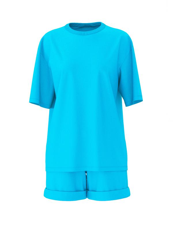 Женский спортивный костюм летний из хлопкового трикотажного полотна. Верх костюма - футболка свободного силуэта оверсайз с заниженой линией плеча, с коротким рукавом. Нижняя часть комплекта - шорты средней длины, с карманами в боковых подрезах, низ шорт - с отворотами. <span>Читать далее</span>
