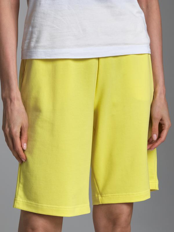 Легкие женские шорты средней длины из хлопкового трикотажного полотна. Карманы прорезные. В пояс вставлена широкая эластичная резина, для дополнительной фиксации пояса можно использовать шнурок.