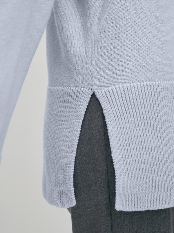 Удлиненный однотонный трикотажный свитер с высоким горлом. Модель с длинным рукавом со спущенным плечом, с резинкой по горловине, манжетам и низу. Высокие разрезы обеспечивают хорошую посадку по бедрам и возможность носить длинный джемпер, в том числе, с расклешенной юбкой. Для модели выбрана нежная пряжа на базе 100% шерсти мериноса. Вязаный трикотаж из шерсти мериноса обеспечивает комфортную температуру для тела, хорошо тянется и не сковывает движения. Если подобрать размер на один-два больше обычного, можно сформировать силуэт оверсайз, он предполагает ношение вещей большого размера, это удобно и стильно. Небесно-голубой теплый джемпер подойдет для офиса, школы, прогулки, встречи с друзьями.