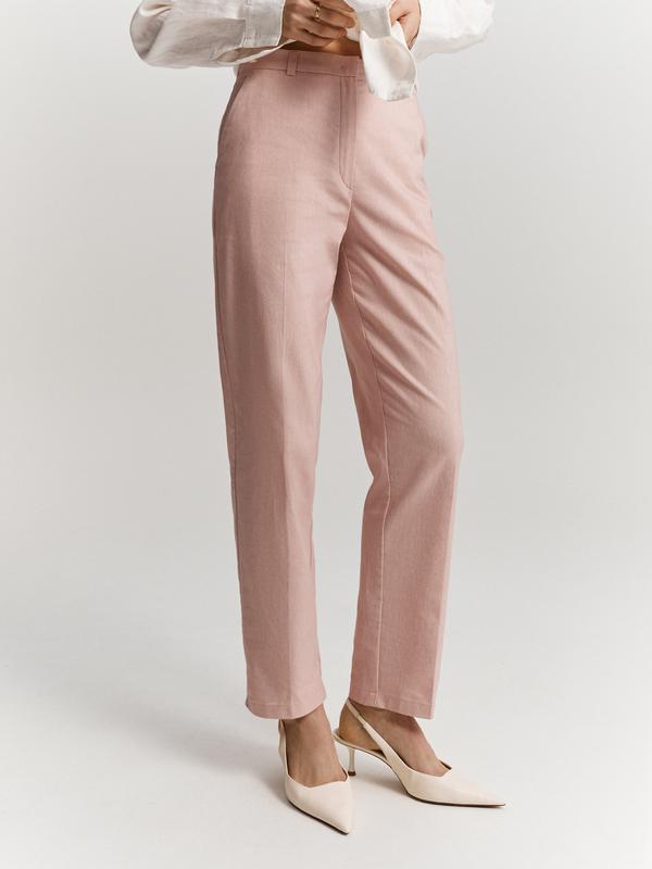Укороченные брюки зауженного силуэта в оттенке припыленной розы выполнены из смесовой ткани на основе хлопка, льна и вискозы. Плотная лёгкая ткань обладает прочностью, не мнется и приятно ощущается на теле. Модель с высокой посадкой и отрезным поясом с защипами визуально вытягивает силуэт. В сочетании с жакетом из коллекции создадут деловой однотонный total look.