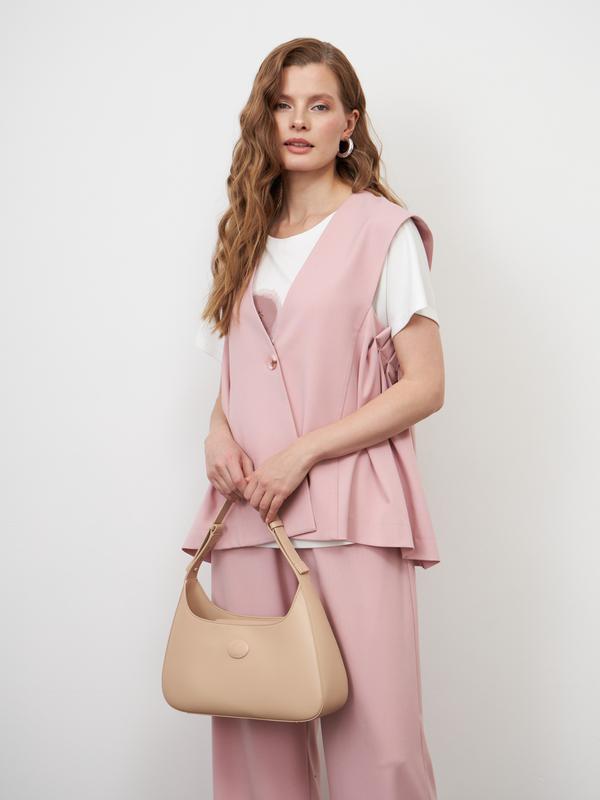 Жилет нежного розового цвета, свободного кроя с низкой проймой и расширенными плечами, сшили из мягкого легкого материала, который поддерживает комфортный микроклимат и не деформируется со временем. Изделие с застежкой на одну пуговицу, без подкладки, декорировали глубокими складками по бокам. Такая вещь станет акцентом в весеннем образе и позволит создать офисные аутфиты поверх привычных футболок и блузок.