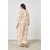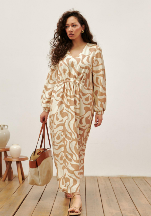 Платье макси свободное с v-образной горловиной и декоративной деталью на уровне талии, под которую заложены сборки по переду. Рукава с манжетой, спущенная линия плеча.