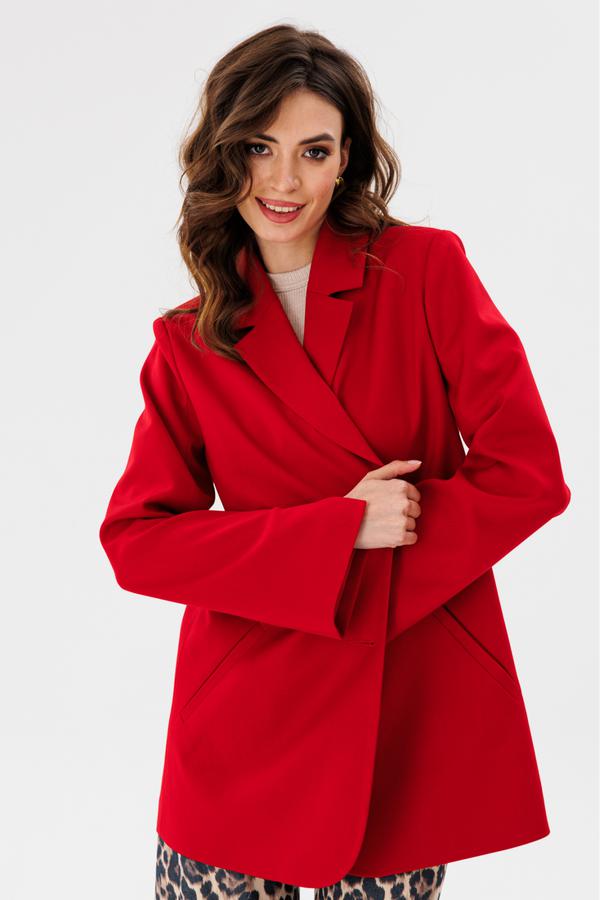 Жакет выполнен из костюмной ткани. Жакет прямого силуэта, длиной ниже линии бедер. Застежка центральная на пуговицы. Спереди прорезные карманы. Спинка со средним швом с удлиненной шлицей. Воротник пиджачного типа. Рукав втачного покроя, двухшовный, со шлицей в переднем шве. Жакет на притачной по низу подкладке. Нижний воротник выполнен из экокожи.