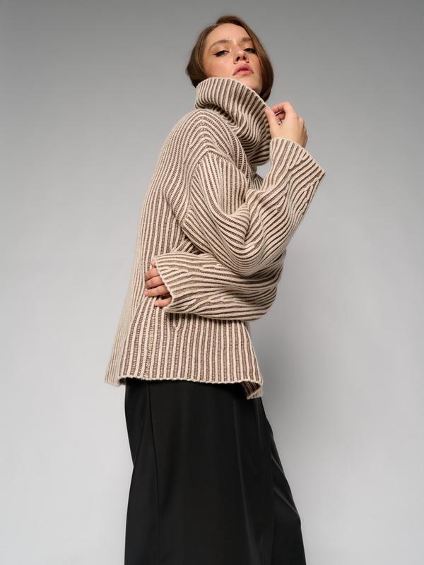 Женский свитер oversize плотной вязки. Модель с длинными спущенными рукавами и высоким воротником, выполнена в кофейных и бежевых тонах. Свитер хорошо сочетается с юбками, брюками, шортами. Несомненно дополнит любой образ.
