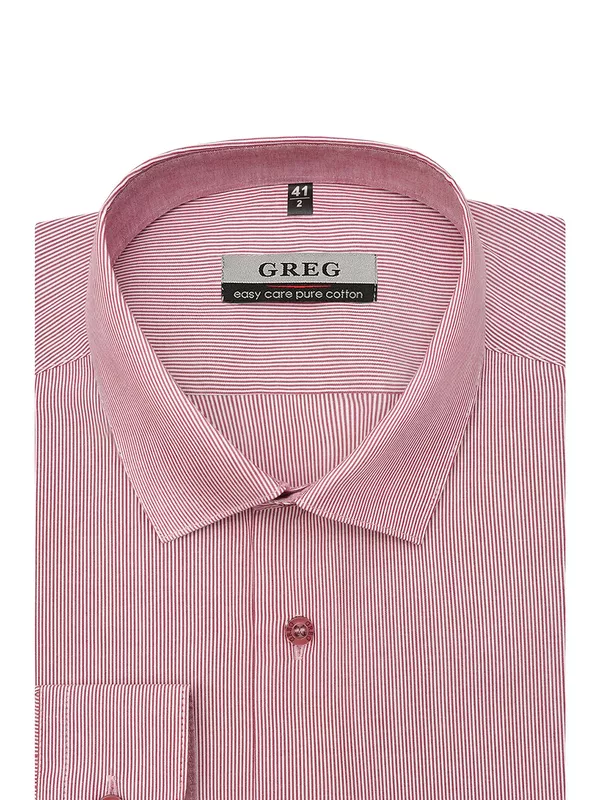 Тип Сорочка мужская длинный рукав. Артикул 161/231/0992/Z/1p. Состав сырья 100% хлопок Easy Care. Бренд GREG. Модель Зауженная. Цвет Красный. Отделка Сорочки: внутренняя стойка воротника и внутренний манжет из ткани компаньона. Ворот Немецкий. Манжет классический закругленный на пуговицах 6 см. Карман отсутствует. Силуэт Полуприталенный силуэт / Regular fit