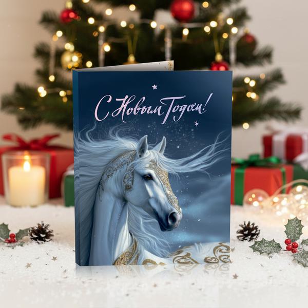 / ★︎ Мини-открытка "С Новым годом (белая лошадь на синем фоне)