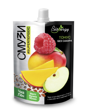 малина, манго, яблоко, семена чиа и льна СМУZИ «BioNergy» - это яркий микс из самых полезных суперфудов: ягод, фруктов, семян, которые быстро насыщают организм пользой и энергией. Удобный формат, который легко можно взять с собой, отсутствие САХАРА, лактозы и глютена, сбалансированные купажи делают этот продукт идеальным полезным перекусом на каждый день. Состав товара - пюре яблочное, пюре малиновое, вода, сок манго концентрированный, пюре манго концентрированное, семена чиа, семена золотого льна, антиокислитель -аскорбиновая кислота