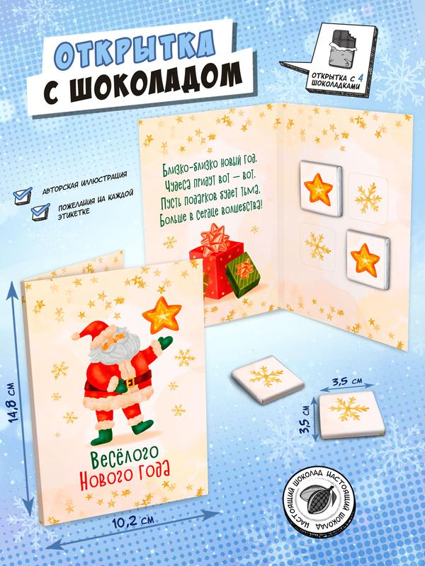 <ul><li>Состав: Какао тёртое, сахар, какао масло, эмульгатор лецитин, натуральный ароматизатор «Ваниль». Общее содержание сухого остатка какао — не менее 36,8%.</li> <li>Срок годности: 18 мес.</li> <li>Вес: 20 гр.</li> <li>РРЦ: 145</li> <li>Серия: Открытки с 4-мя шоколадками</li> <li>Вид продукции: Шоколад</li> <li>Размер: 10,2 х 14,8 х 1 см.</li></ul><br/><br/><p>Дед Мороз весельчак точно будет радовать получателя подарка!</p>