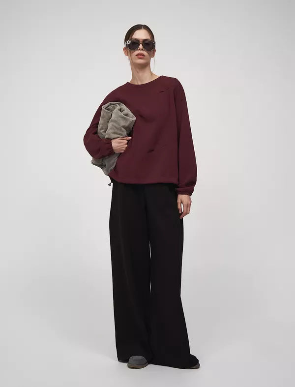 Широкие брюки прямого силуэта с посадкой на уровне талии. По поясу встроена резинка для регуляции приталивания. По бокам — карманы с контрастной вышивкой. Сзади накладной карман с вышивкой. Выполнены из хлопка (95%) с добавлением спандекса. Представлены в черном цвете.