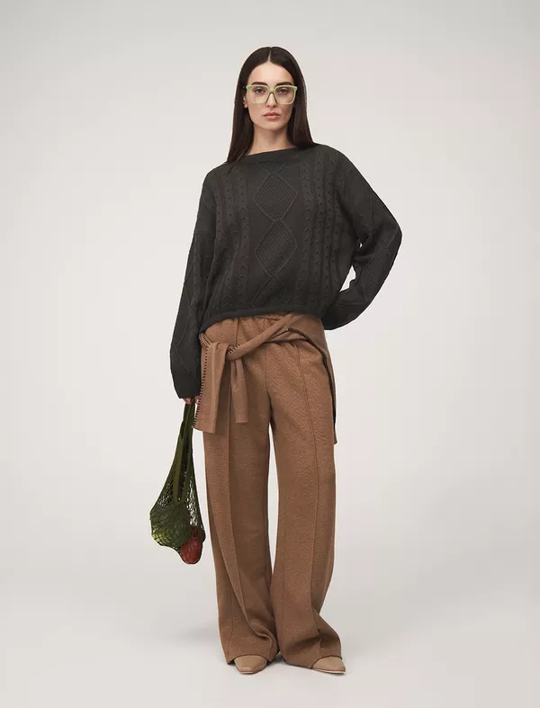 Джемпер силуэта оверсайз с фактурной вязкой и эффектом деграде. Горловина круглая, линия плеча спущена. По низу встроен шнурок с фиксатором для затягивания. Выполнен из хлопка и акрила, что обеспечивает комфорт и долговечность. Представлен в темно-сером, слегка выбеленном цвете.