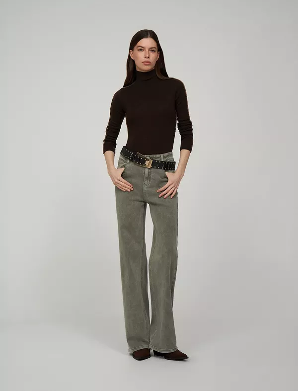 Джинсы прямого силуэта с посадкой на уровне талии. Пояс отрезной, с шлевками. По передней части изделия — классический гульфик с молнией и застежка на пуговицу. По бокам врезные карманы с отрезным бочком и маленький карман с правой стороны. На задней части изделия — кокетка, кожаный патч HASS и два накладных кармана, один из которых рваный, настроченный поверх другого маленького кармана. В составе хлопок (90%) и спандекс. Представлены в зеленом цвете с варкой, придающей изделию винтажный эффект.
