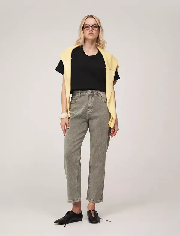 Джинсы зауженного к низу силуэта с посадкой на талии, укороченные. Деликатная варка придает состаренный эффект. По передней части изделия карманы и гульфик с застежкой на молнию и пуговицу. Сзади кокетка, накладные карманы и брендированный патч HASS. По поясу расположены шлевки. Ткань выполнена из хлопка с добавлением полиэстера и спандекса, что продлевает срок эксплуатации изделия и обеспечивает удобство в носке.