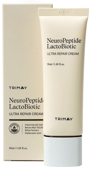 Крем Trimay NeuroPeptid Lacto Biotic Ultra Repair Cream оказывает комплексное действие на кожу, заметно улучшая ее состояние. Содержание пептидов, керамидов и аденозина обеспечивает антивозрастное действие средства, предупреждая появление таких возрастных изменений, как потеря упругости, провисание матрикса, тусклость и расплывчатость контуров лица.Благодаря высокому содержанию cокa японской берёзы и центеллы крем помогает в лечение акне, обладает выраженным успокаивающим действием, снимает зуд и раздражения. Крем помогает разгладить мелкие кожные заломы, мимические морщинки и способствует сокращению глубины более выраженных морщин.