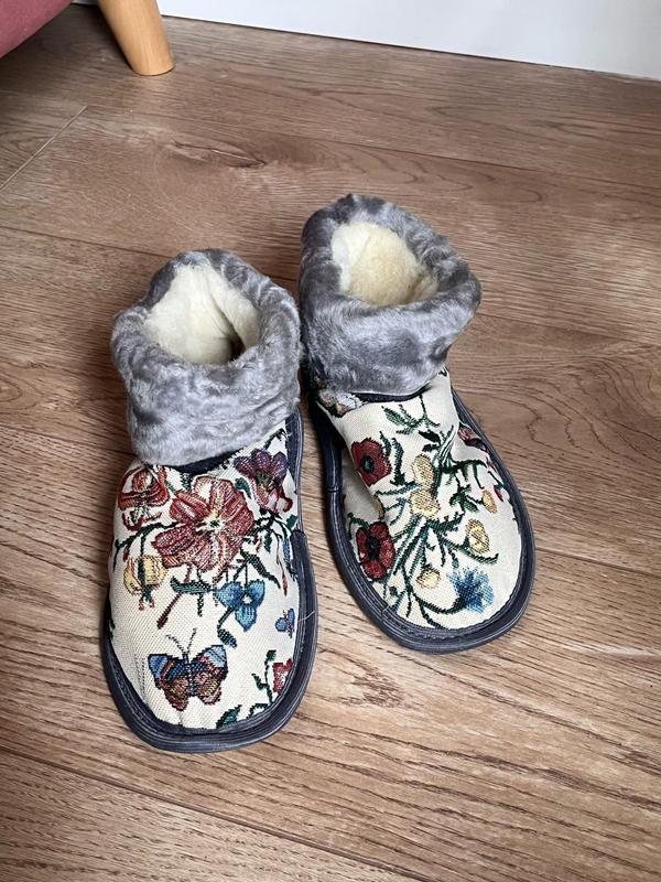 При первой носке тапочки могут показаться малы из-за плотного меха. Через несколько дней носки, мех изделия примнется и тапочки сядут по ноге. Меховые тапочки положить в мешочек для стирки; выбрать гель или другое жидкое стиральное средство для шерстяных вещей; выставить температуру 20 градусов и режим бережной стирки. Сушить комнатную обувь вдали от обогревательных приборов.<br />Благодаря натуральной овчине нога в тапочках потеет минимально, создается эффект "сухого тепла".<br />Обращаем ваше внимание, что цвет опушки и расцветка принта на гобелене может отличаться от того, что представлено на фотографии. Расцветка опушки выполнена в тон к основному цвету, либо может быть белая. Расцветка гобелена индивидуальна на каждой паре.<br />Замеры по подошве в сантиметрах:<br />36 - 23<br />37 - 23,8-24<br />38 - 24,5<br />39 - 25,5<br />40 - 26<br />41 - 26,5