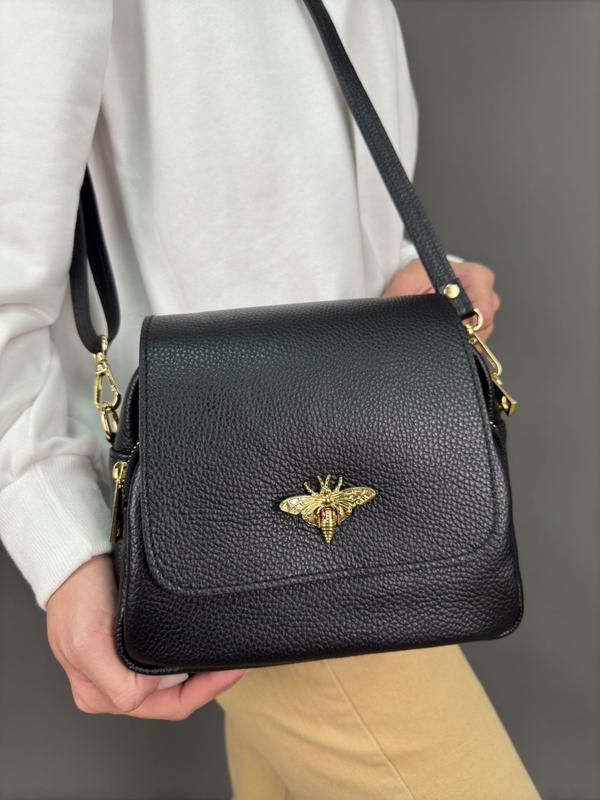 <p>Небольшая очень красивая сумка из натуральной кожи для нежного женственного образа. Золотая бабочка-застежка делает эту сумку запоминающийся и уникальной. Закрывается на крышку и на молнию сверху. Внутри небольшой карман на молнии. Снаружи вместительный карман на молнии.<br>