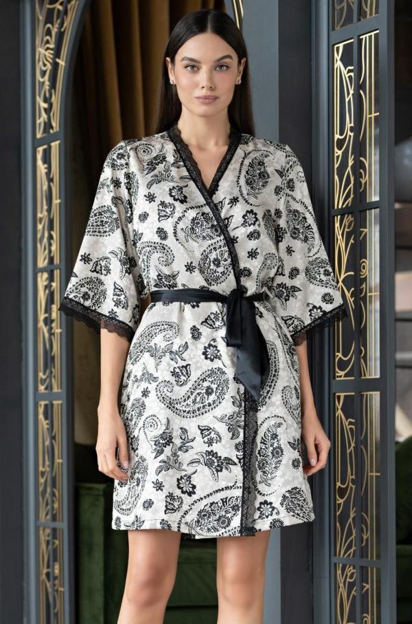 Короткий классический халат-кимоно Mia-Amore из принтованного синтетического шелка с жаккардовой основой. Халат с рукавом длиной до линии локтя. Борта и низ рукавов обработан узким черным кружевом. Пояс халата выполнен из черного атласа.