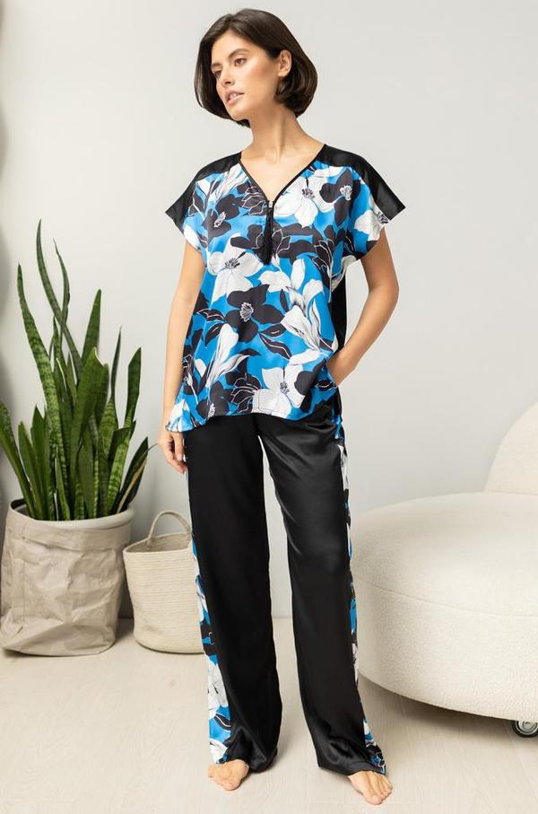 Оригинальный комплект Mia-Amore состоит из блузы с удлинёнными плечами и брюк, выполнен из искусственного шёлка. По бокам однотонных брюк вставки из принтованного шёлка. Спинка блузки также выполнена из однотонного атласа, спереди блузы принт и воротник декорирован молнией с кисточкой. В брюках есть карманы.