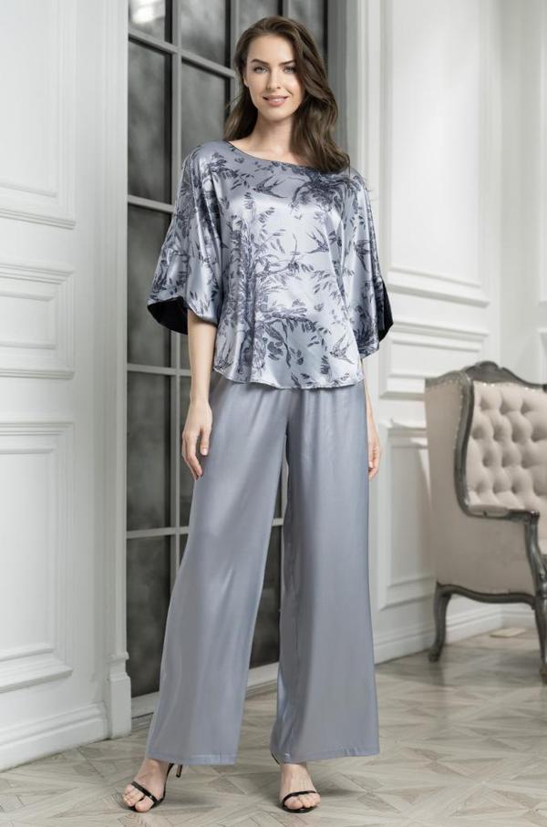 Комплект Mia-Amore состоит принтованного топа свободного силуэта и однотонных широких брюк-палаццо. Комплект выполнен из смесового шелка. Состав: 70% натуральный шелк, 25% полиэстер, 5% эластан