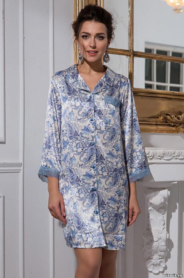 Длинная рубашка Mia-Amore из смесового шелкового полотна с нежным голубым рисунком. Состав 70% натуральный шелк, 25% полиэстер, 5% эластан