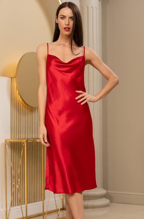 Сорочка Mia-Amore средней длины без подреза на тонких регулируемых бретелях выполнена из однотонного смесового шёлка. Спереди вырез лифа сорочки оформлен в виде воротника-качели, на спинке декор из вышивного кружева и изящный вырез по центру. По центру спереди расположен декоративный бантик с подвеской.