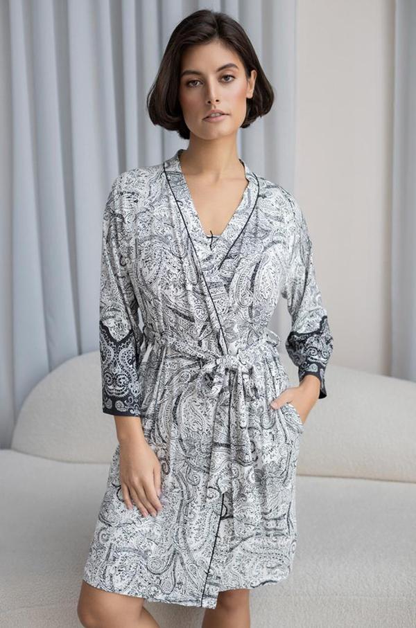 Короткий запашной халат Mia-Amore с рукавом длиной ¾. Халат выполнен из принтованного в виде купона трикотажного полотна. По бокам расположены карманы. По линии борта изделия проходит тонкий контрастный кант.