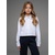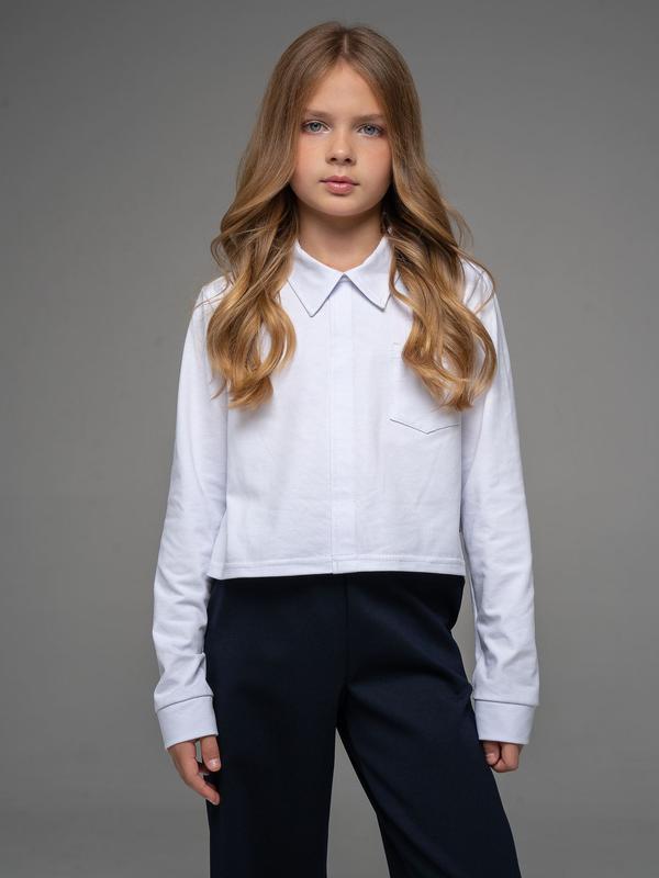 Укороченная рубашка свободного силуэта из кулирки белого цвета для девочки, с имитацией центральной застежки, нагрудным карманом и отложным воротником. Изделие выполнено из трикотажа премиального качества - ПЕНЬЕ, с содержанием хлопка более 95%