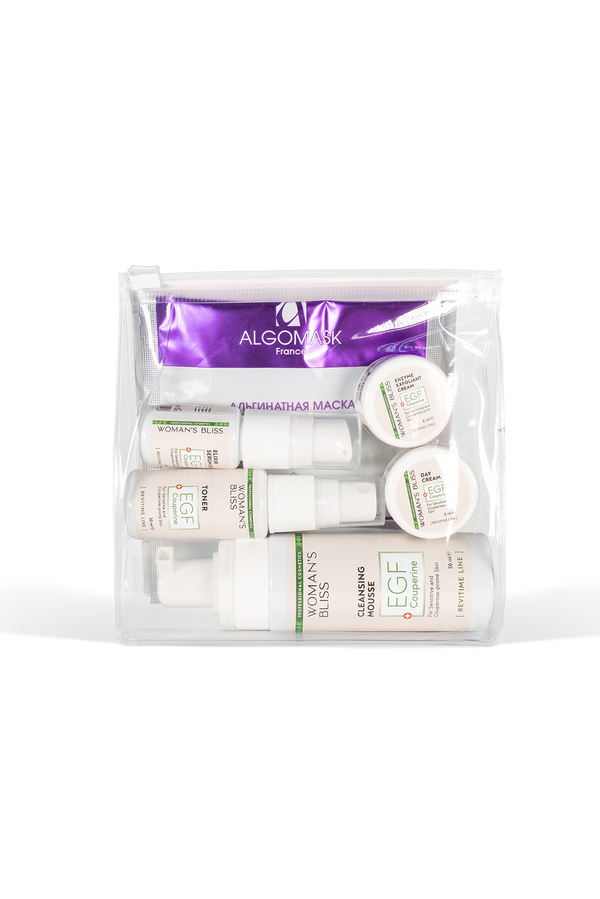 <ul><li>Артикул: NB72</li> <li>Страна: Россия</li></ul><br/><br/>Показания к применению: Раздраженная и обезвоженная кожа, кожа, перенесшая травмирующие процедуры, тусклый цвет лица, снижение тургора и эластичности. Чувствительная кожа<br> <br> СОСТАВ НАБОРА:<br> - Очищающий мусс REVITIME (50 мл)<br> - Нежный тоник REVITIME (20 мл)<br> - Энзимный крем-эксфолиант REVITIME (5 мл)<br> - Крем дневной REVITIME (5 мл)<br> - Гель сыворотка-эликсир REVITIME (10 мл)<br> - Альгинатная маска ALGOMASK с EGF (25 г)<br> - Протокол процедур<br> - Удобная дорожная косметичка