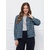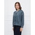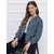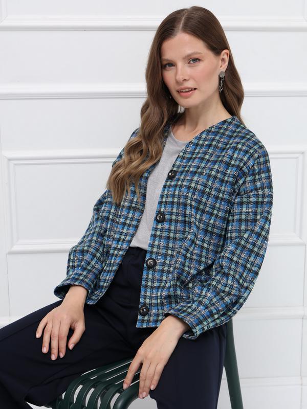 Лёгкий трикотажный жакет, без подкладки, с принтом «микроклетка» в сине-серой гамме. Модель без воротника с U-образным вырезом и застёжкой на пуговицы, напоминает кардиган. Мягкая линия плеч и аккуратные складки по низу и на рукавах придают образу женственность и делают прямой силуэт более пластичным.