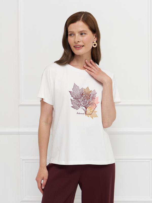 Джемпер с короткими цельнокроеными рукавами, выполненный из мягкого вискозного трикотажа. Модель с круглой горловиной и прямым кроем обеспечивает комфорт и свободу движений. Украшен дизайнерским принтом, передающим атмосферу осеннего настроения.