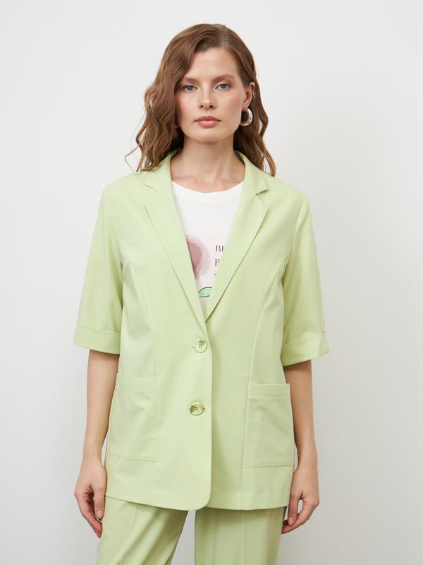 Однобортный жакет с короткими рукавами, узкими лацканами и прямой линией плеч, выполнили из легкого костюмного материала, пропускающего воздух, светлого оттенка зеленого винограда. Полуприталенную модель на двух пуговицах дополнили накладными карманами и шлицей по низу спинки. Облегченная версия классического жакета для жарких офисных будней.