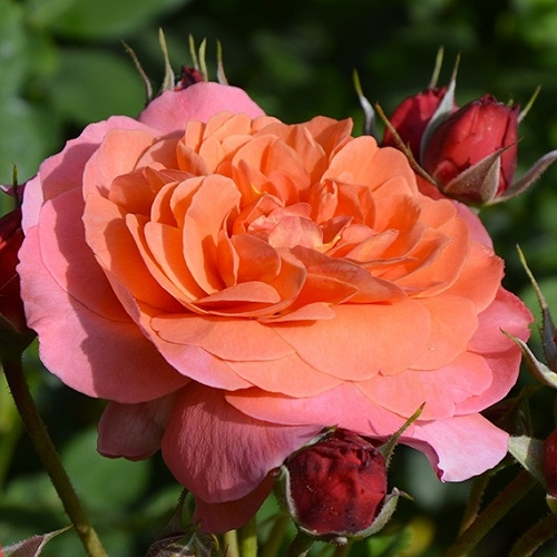 Шраб. Темно-оранжево-красные бутоны яйцевидной формы раскрываются в большие 12см диаметром цветы с гармоничным для этой розы сильным фруктовым ароматом. Густомахровые с 60 лепестками чашевидной формы цветы яркого оранжевого цвета с лососевыми оттенками сгруппированы в букеты от 9 до 11 цветков. Куст средней густоты, вертикальный, энергичного роста от 100 до 130см высотой и 100 до 120см шириной. Листва средне-зеленая полуглянцевая с 5-7 листочками. Цветение обильное волнами в течение всего сезона. Цветы устойчивы к жаре и отцветают чисто. Сорт устойчивый к заболеваниям мучнистой росой и черной пятнистости, стойкий к ржавчине.