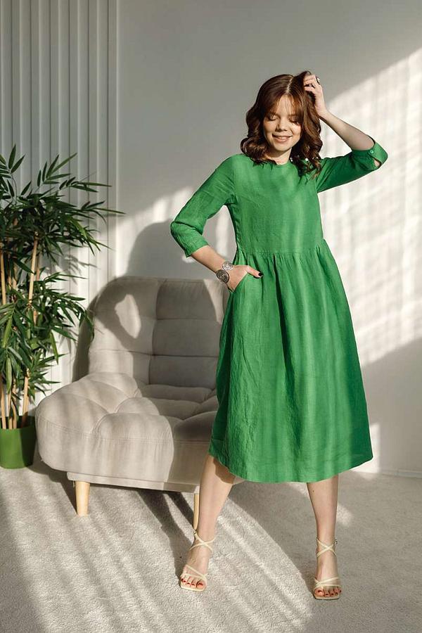 <p>Тёплое время года позволяет нам более смело подходить к выбору одежды. Примерить на себя то, на что в зимний период ты вряд ли осмелился. Жара провоцирует нас на эксперименты с цветами, силуэтами и стилями. Интуитивно мы выбираем более комфортные и свободные вещи, которые не сковывают наших движений. Представленная модель льняного платья, вряд ли заинтересовала вас в осенне – зимний период. А вот летом оно незаменимо. Прямой полуприлегающий силуэт очарует вас своим комфортом. Талию выгодно подчеркивает мелкая сборка на юбке, создавая женственный нежный образ. Универсальная длинна чуть ниже линии колена будет хорошо сочетаться с любой обувью, будь то высокий каблук туфель или плоская подошва сандалий. Лаконичность и сдержанность декоративных элементов оставляют вам «поле» для фантазии. Вы можете на своё усмотрение «расставить» цветовые и стилистические акценты. А уникальные свойства натурального льна, из которого изготовлена модель, вы сможете в полной мере оценить, став обладательницей этого платья.</p>